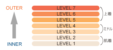 PCUの利点と言えばその優れたレイヤリング(重ね着)システムと言えるでしょう。7LEVEL(層)によって構成され、それらを環境に応じて組み合わせることにより、最適な状態での活動を可能にしてくれます。