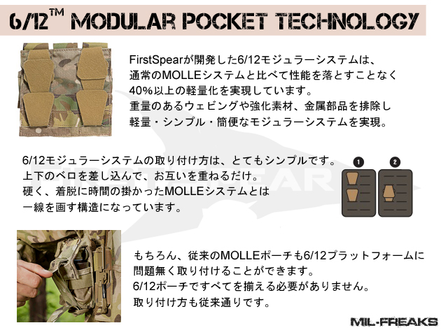 ポーチ類取り付けに使用するモジュラープラットフォームはMOLLEではなく、革新的な6/12システムです。