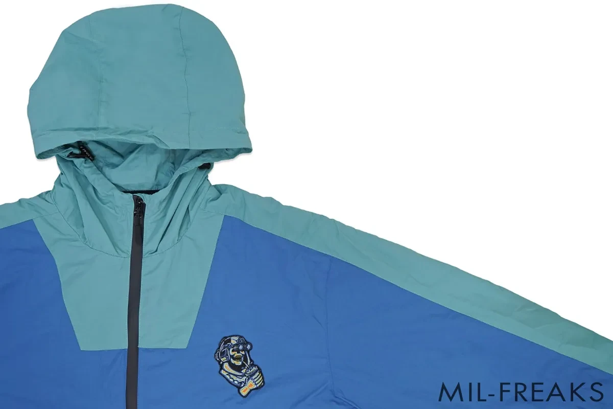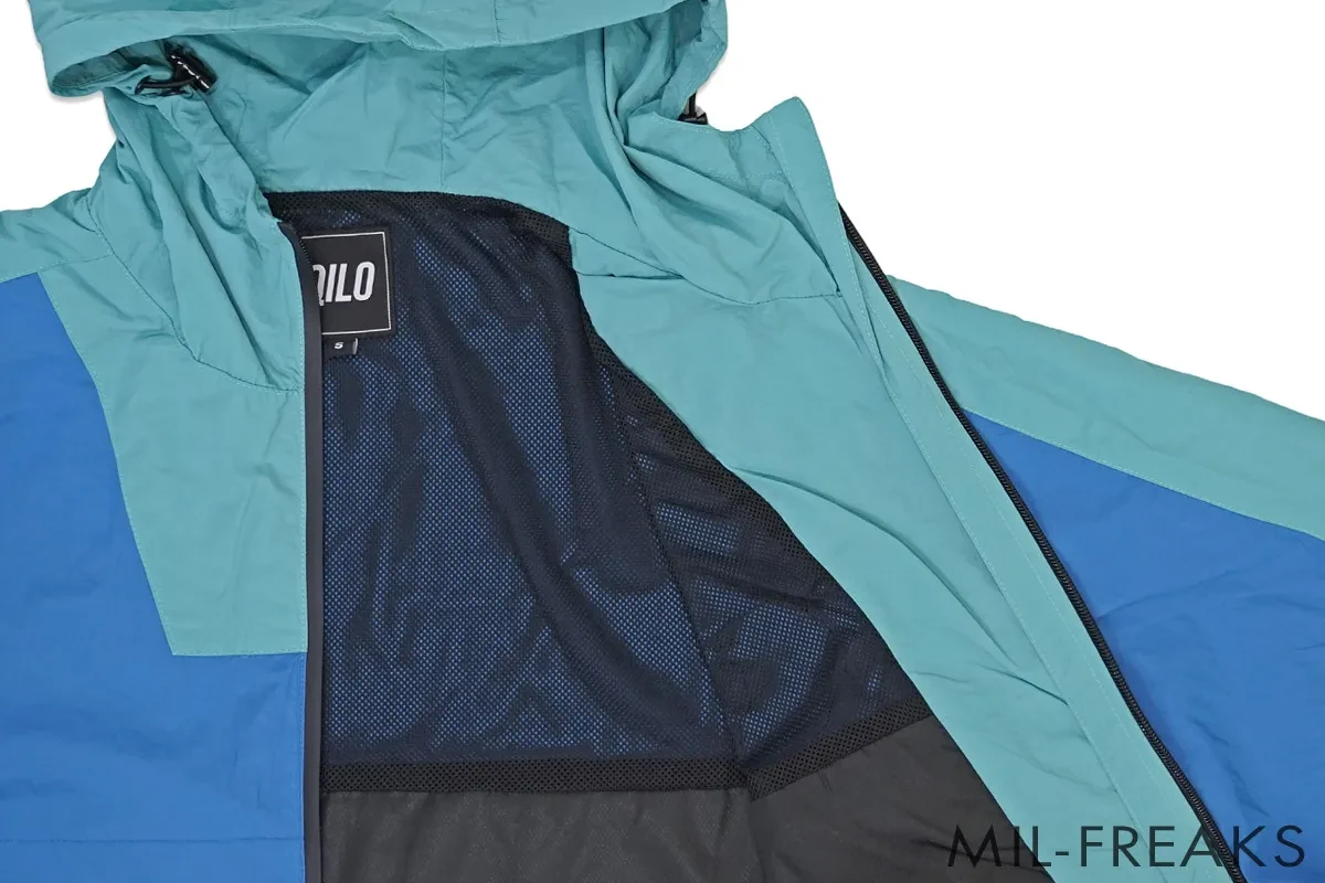 スカイブルー、ターコイズ、イエローといったレトロなカラーの組み合わせを大胆に使用したウィンドブレーカーです。