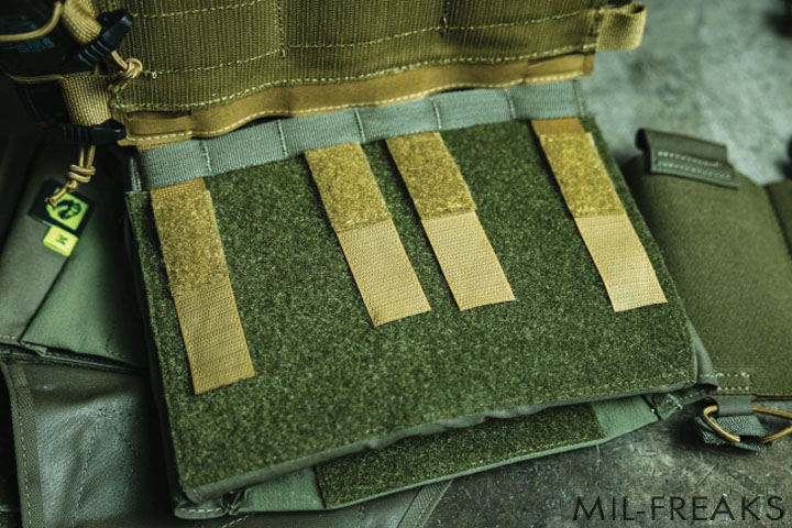 加えてフロントパネルのカマーバンド上部のウェビングによって、Crye製AVSやJPC2.0に使用するパネルシステムの取り付け方法によく似た、T.REX独自のパネルシステム (MOLLE Row Placard Interface) を運用できるようになっています。