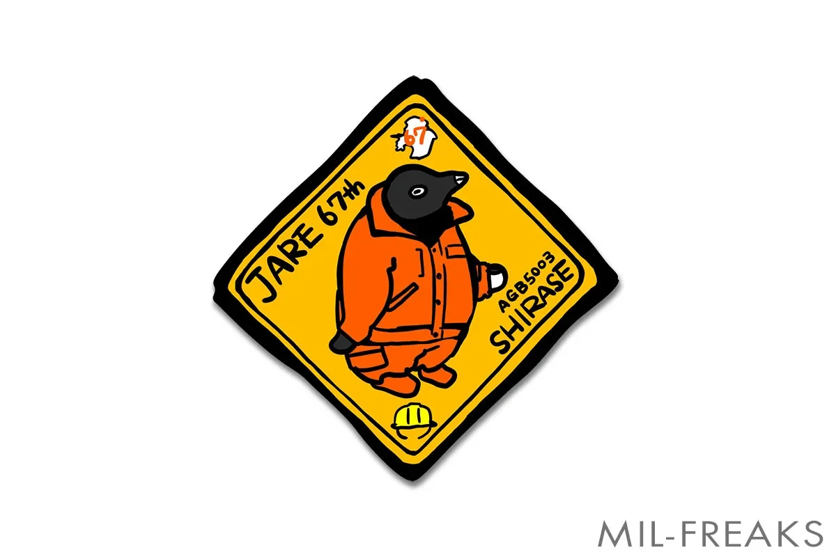 第67次(JARE67)派遣記念と、艦名 AGB5003「しらせ / SHIRASE」、昭和基地に設置されている看板「動物注意」のアデリーペンギンのイラストがモチーフとなっています。