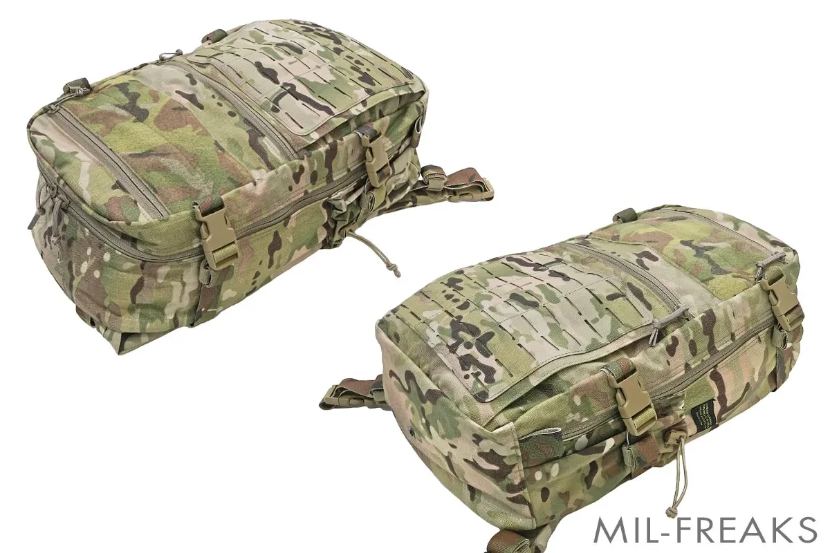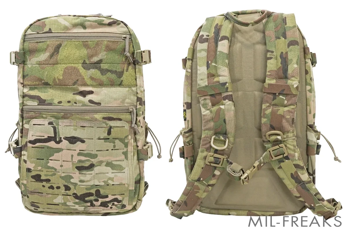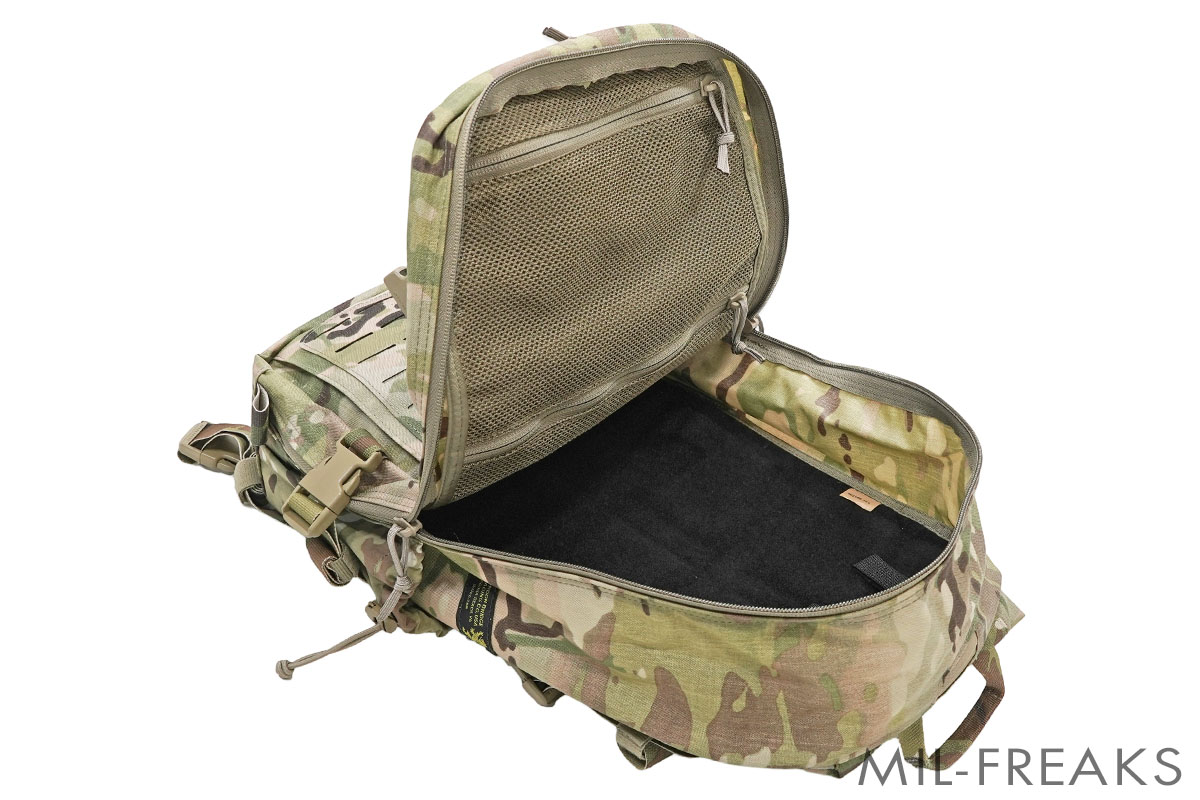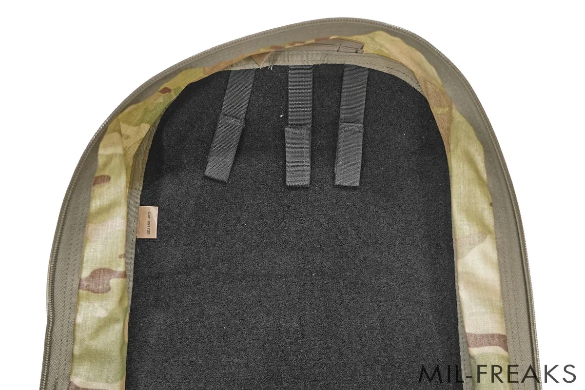 バックパックの正面には大型のベルクロシートとレーザーカットされたMOLLEプラットフォームをもち、拡張性に優れています。