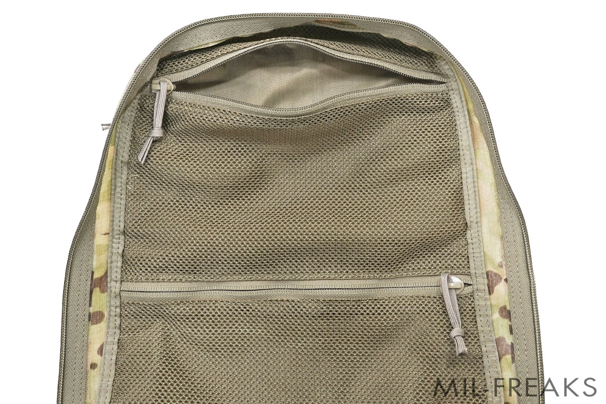 内部はメッシュ生地を使用したインナーポケットがあり、その反対側はベルクロポーチやパッチ等を貼り付けてカスタマイズできるようになっています。