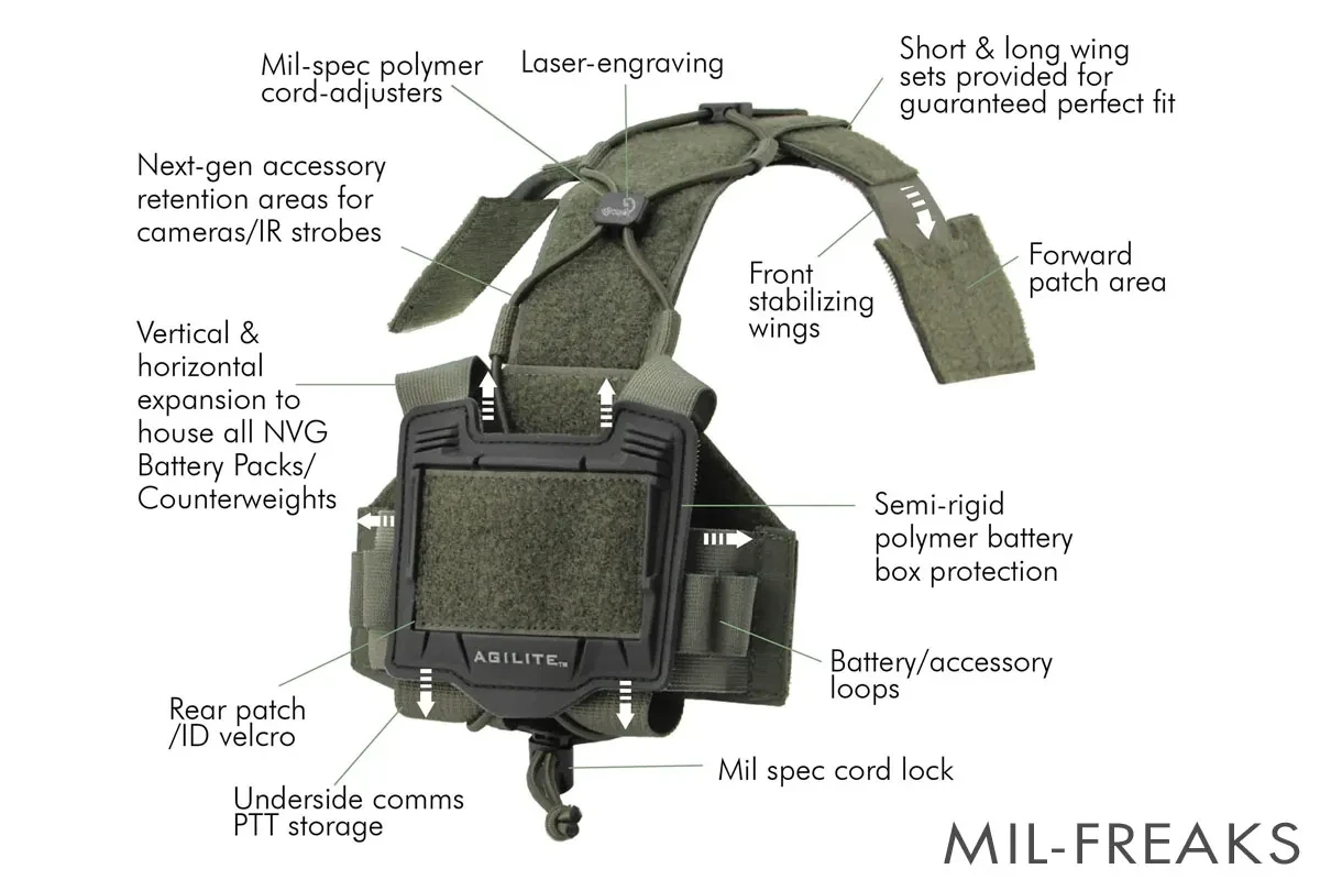 後部に配置された独自のユニバーサルポーチは縦横に伸縮し、GPNVG-18、AN/PVS-31、AN/PVS-23、F5050、AVS-6、ANVIS9といった一般的なNVGバッテリーパックやカウンターウェイトに対応します。
