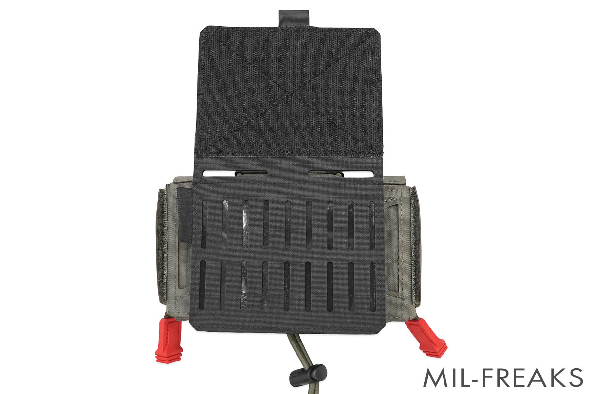 この画期的な仕組みにより、プレートキャリア下部に取り付けてMOLLEポーチ用をハンガー化させることも、カマーバンドと一緒に横向きに取り付けて脇にMOLLEを拡張させるウィングとしても利用可能です。