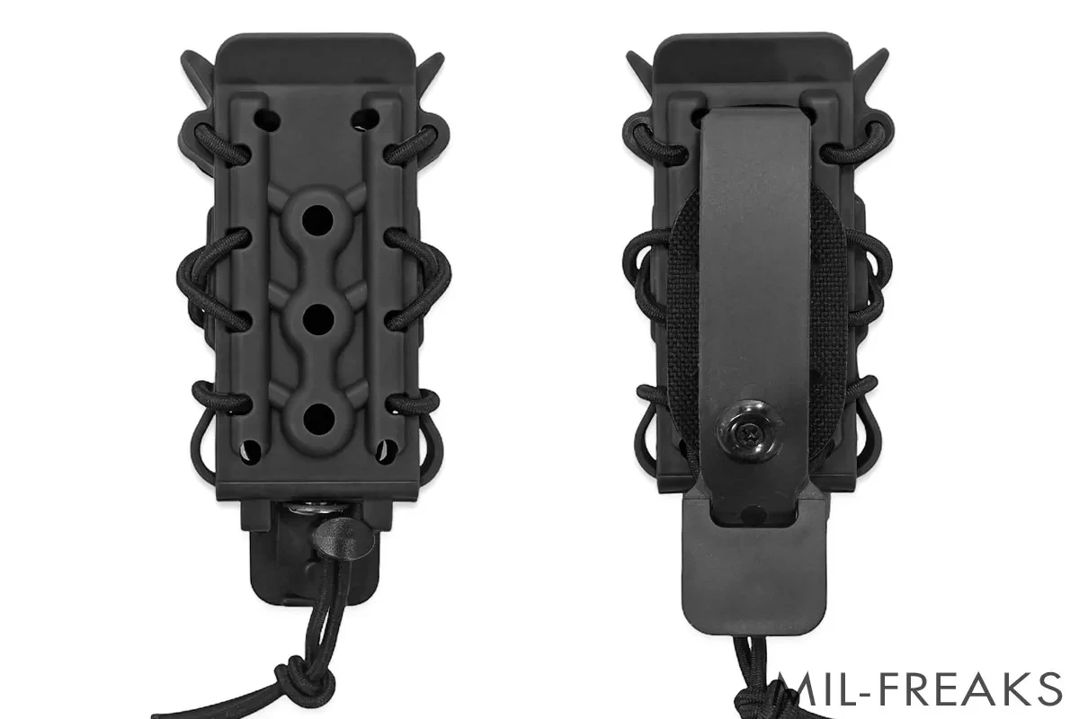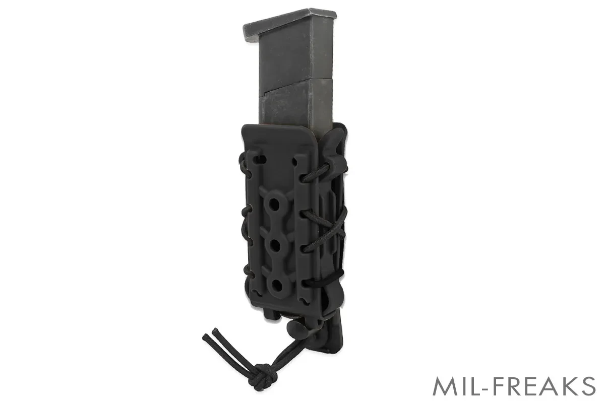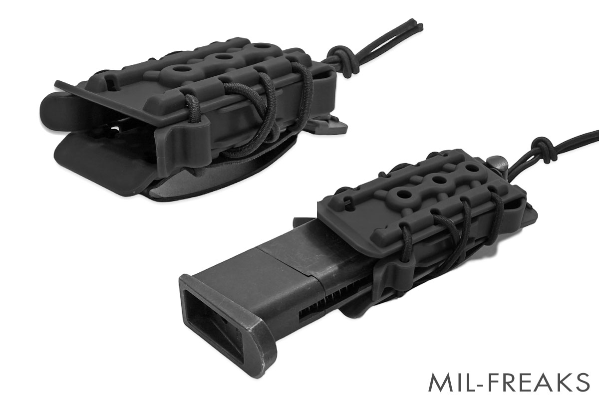 ボディをバンジーコードで編み上げる構造により、多種多様な口径のピストルマガジンやフラッシュライトなどを一つのポーチで保持できる点が大きな強みです。