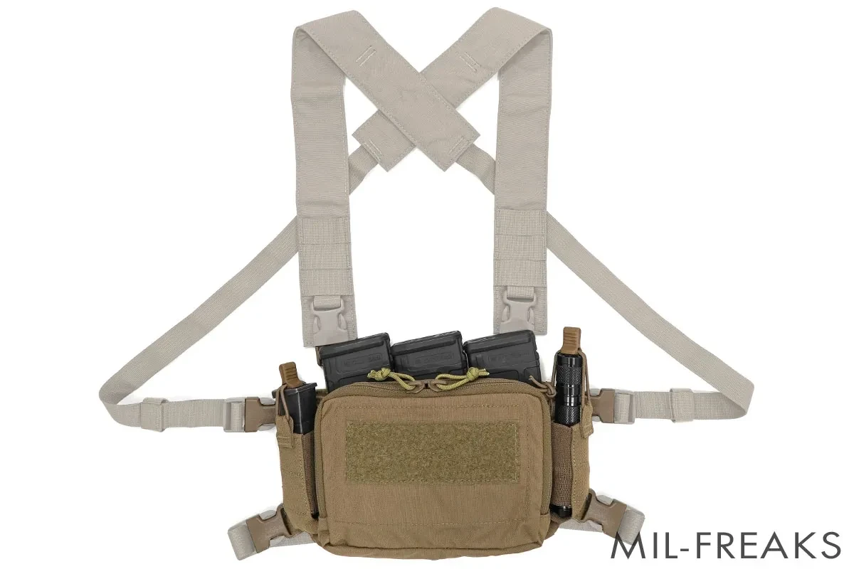 最大の特徴は、マガジン収納スペースにインサートポーチを使用しモジュラー化することで従来のように使用するマガジンサイズによってリグ自体を変える必要がなく、このマイクロリグ一つで完結します。