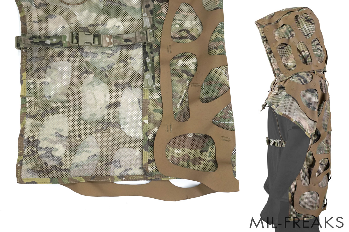 このLWAGはマルチカムパターンのメッシュ生地をベースに構成されており、ダークアースカラーの独特な形状の強化素材で型取ることで、着用した時に人間のシルエットをぼかす形状になるようになっています。