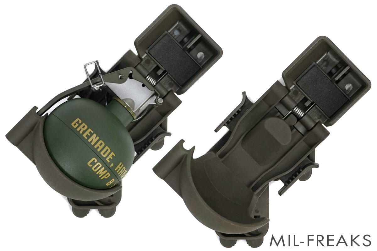 従来のポーチでは安全ピンやレバー、グレネード本体が固定されず、不安定な状態で収納されていましたが、トリガーポーチはそのような危険な状態をすべて解決し、安全で確実な作戦遂行をサポートします。