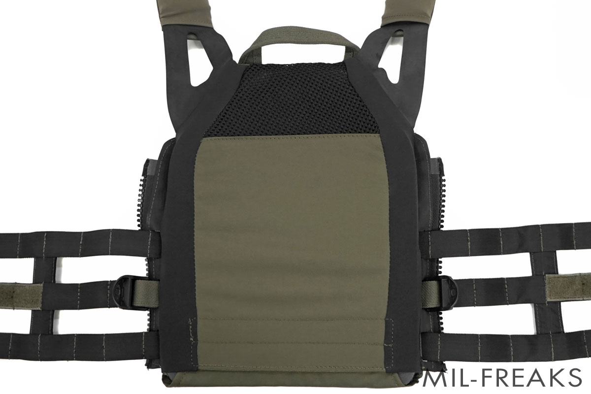 サイドはMOLLEウェビングだけで構成されており、軽量化と通気性を大きく向上させています。