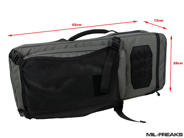 SMGやカービンライフル (全長62cmまで) またはテイクダウンしたロングライフルを収納できます。