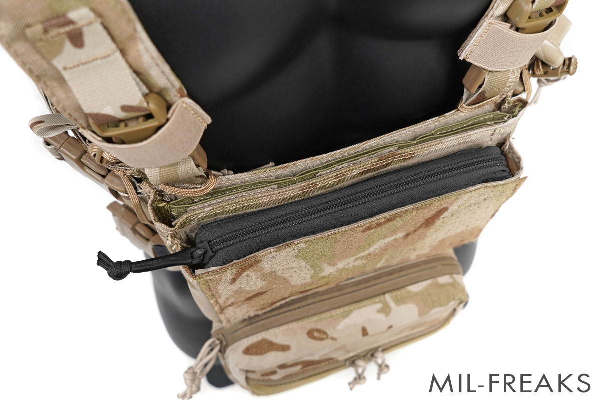 ポーチフラップはチェストリグのフロントポケットに取り付けることができます。