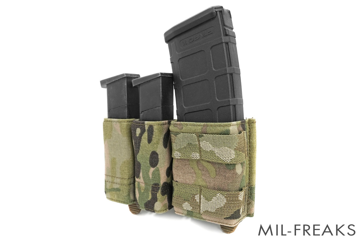 ライフルマガジンはM4などの5.56mmサイズのマガジンに対応し、ピストルマガジンはグロックなどの2カラムマガジンから、1911などのシングルカラムまで各種フィットします。