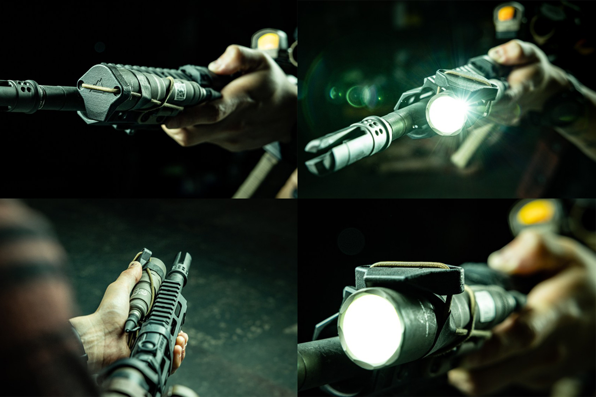 これにより、目立つライトヘッドは必要なときにのみ敵へ向けられることとなり、ライトの運用上最も危険なミスである過失照射に対する安全装置としても機能します。