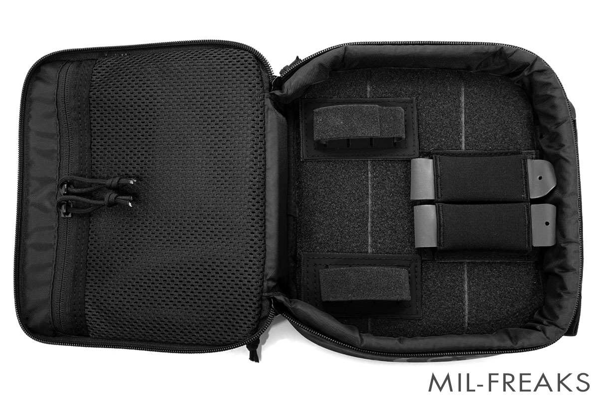 内部はメッシュのジッパー付きサブポケット、もう片面にはベルクロシートが貼られており、付属の固定用バンドとポーチを自由に配置することができます。