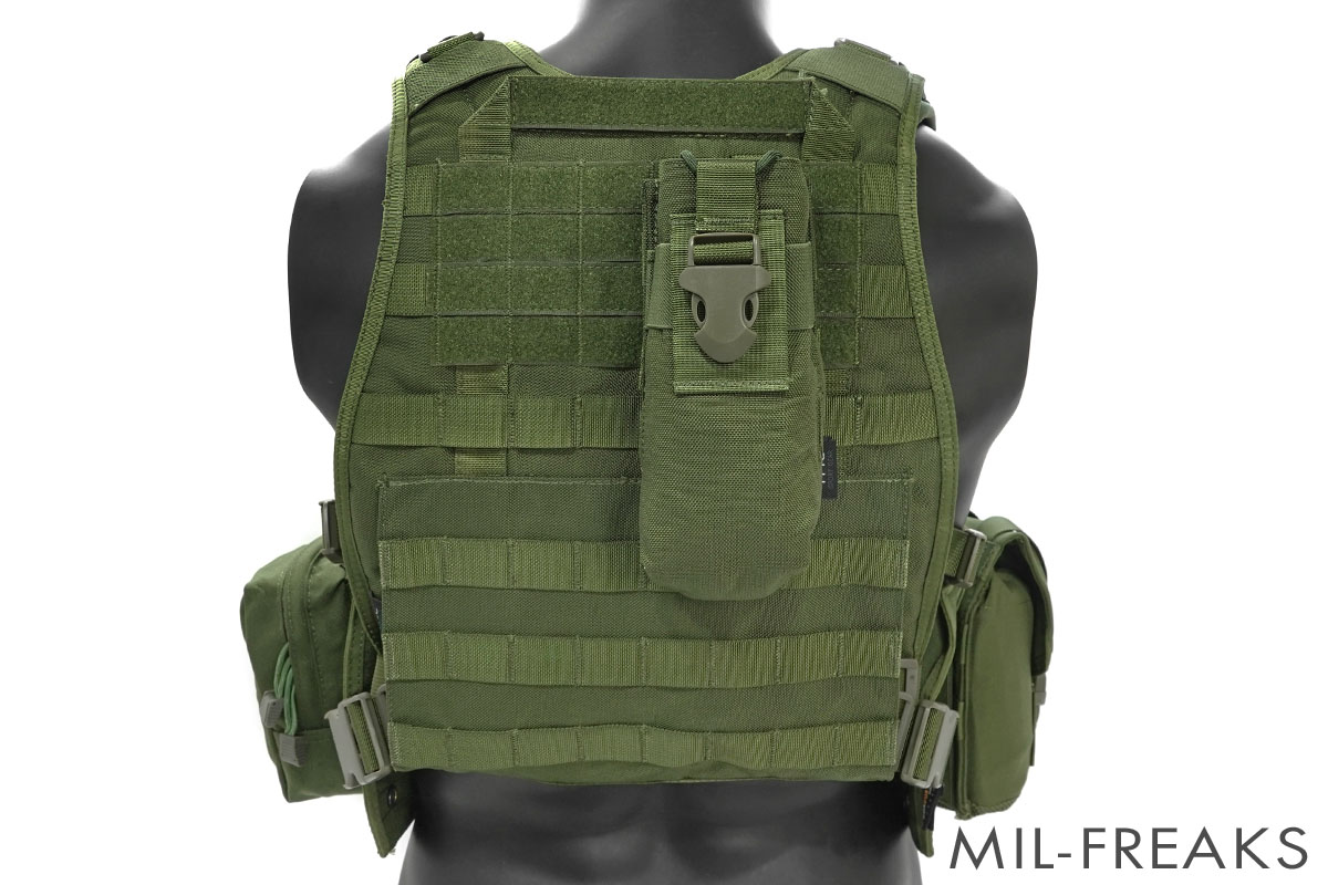 米軍をはじめ各国で使用されている定番のリコンベストにバックパネルが接続され、5種・計6個のMOLLEポーチがセットになっています。