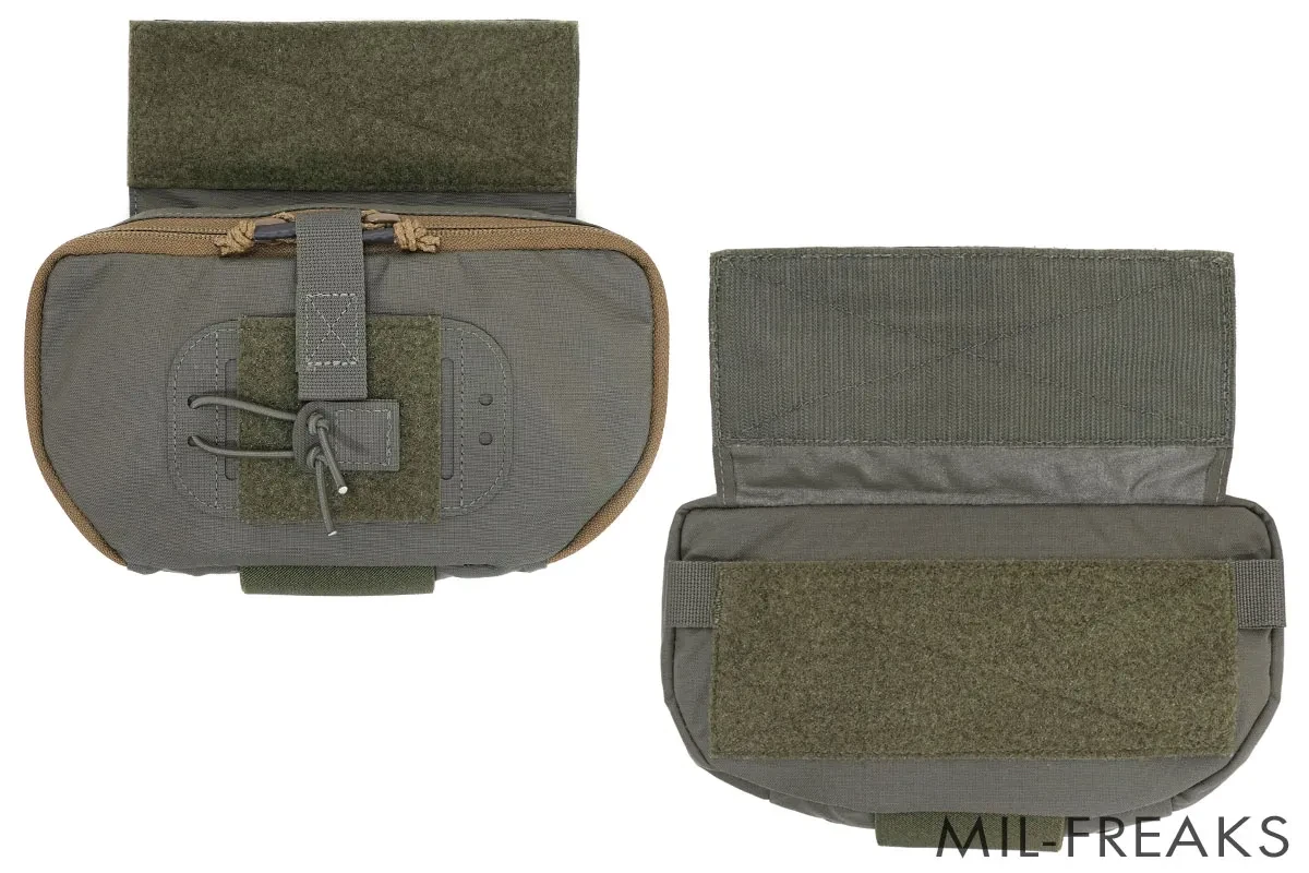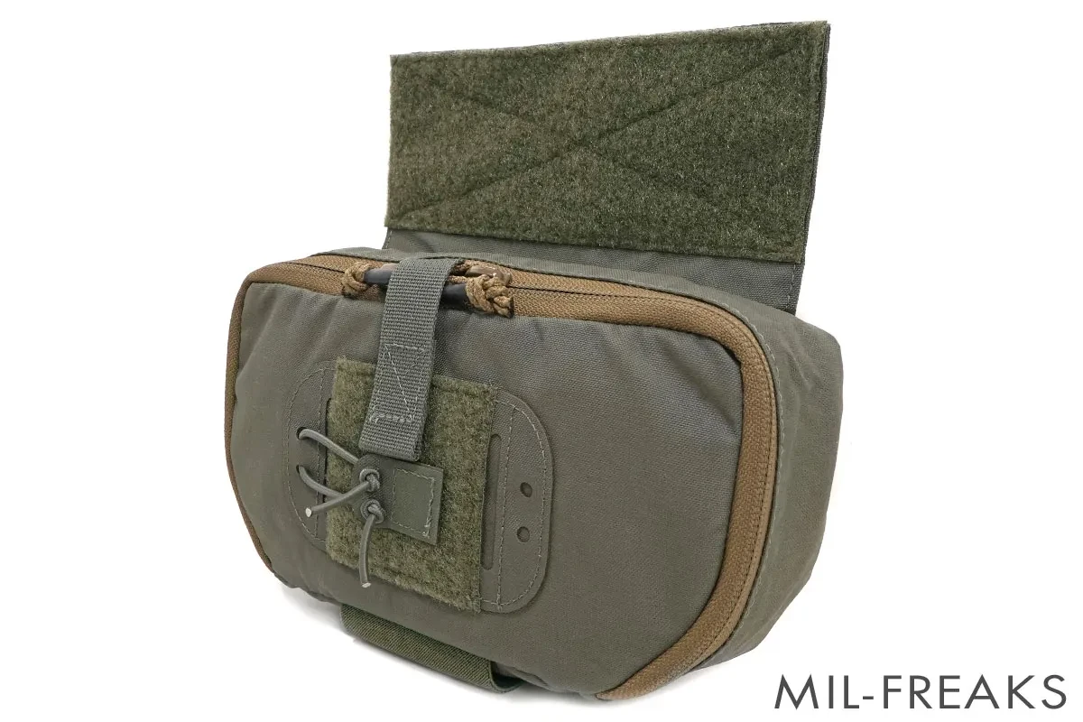 ベルクロタブで保持可能なので、ジッパーを全開にしていてもポーチを閉じておくことができ、この状態では瞬時に展開が可能なので、開け締めが頻発するシチュエーションで活躍します。
