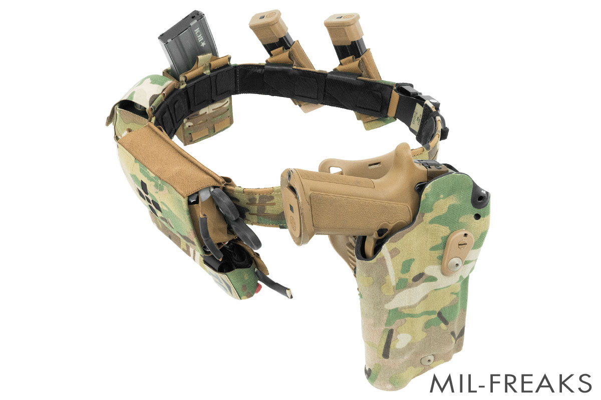 人間工学に基づいた 45度の角度でピストルマガジンポーチやライトポーチを取り付けて、より効率的なドロー/リロードを実現します。