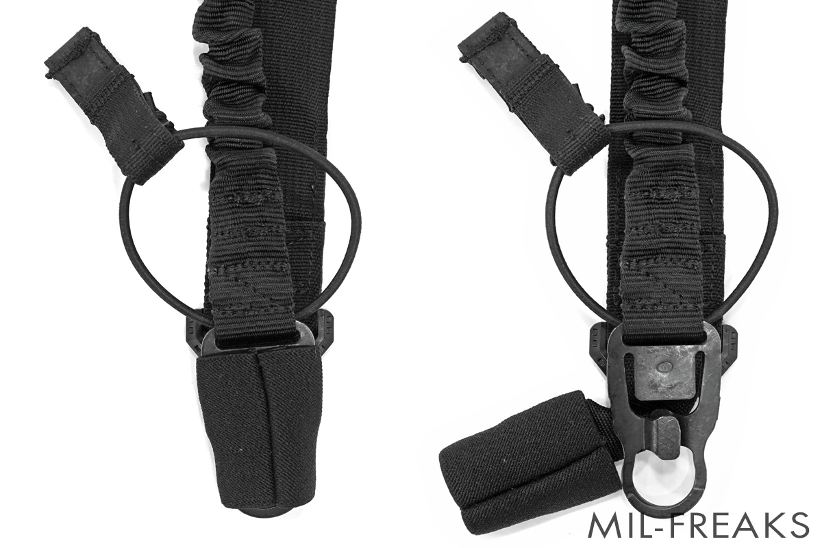 プルタブ付きのバンジーコードがスリング根本に配置されており、航空機や車両での移動中にスリングを外すことなくコンパクトに纏めておくことができます。