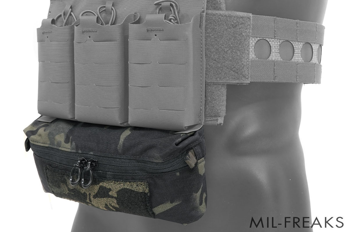 このドロップポーチは補助バッグとして使用されることの多いファニーパック (ウエストポーチ) をプレートキャリアへ接続できるオプションとして設計された多目的ポーチです。